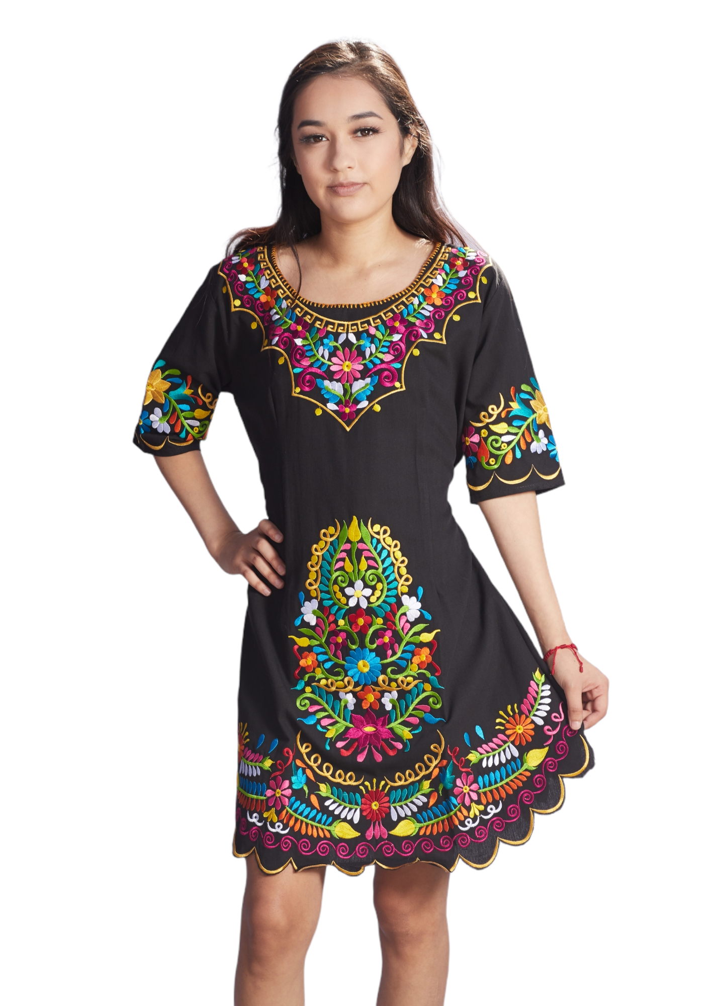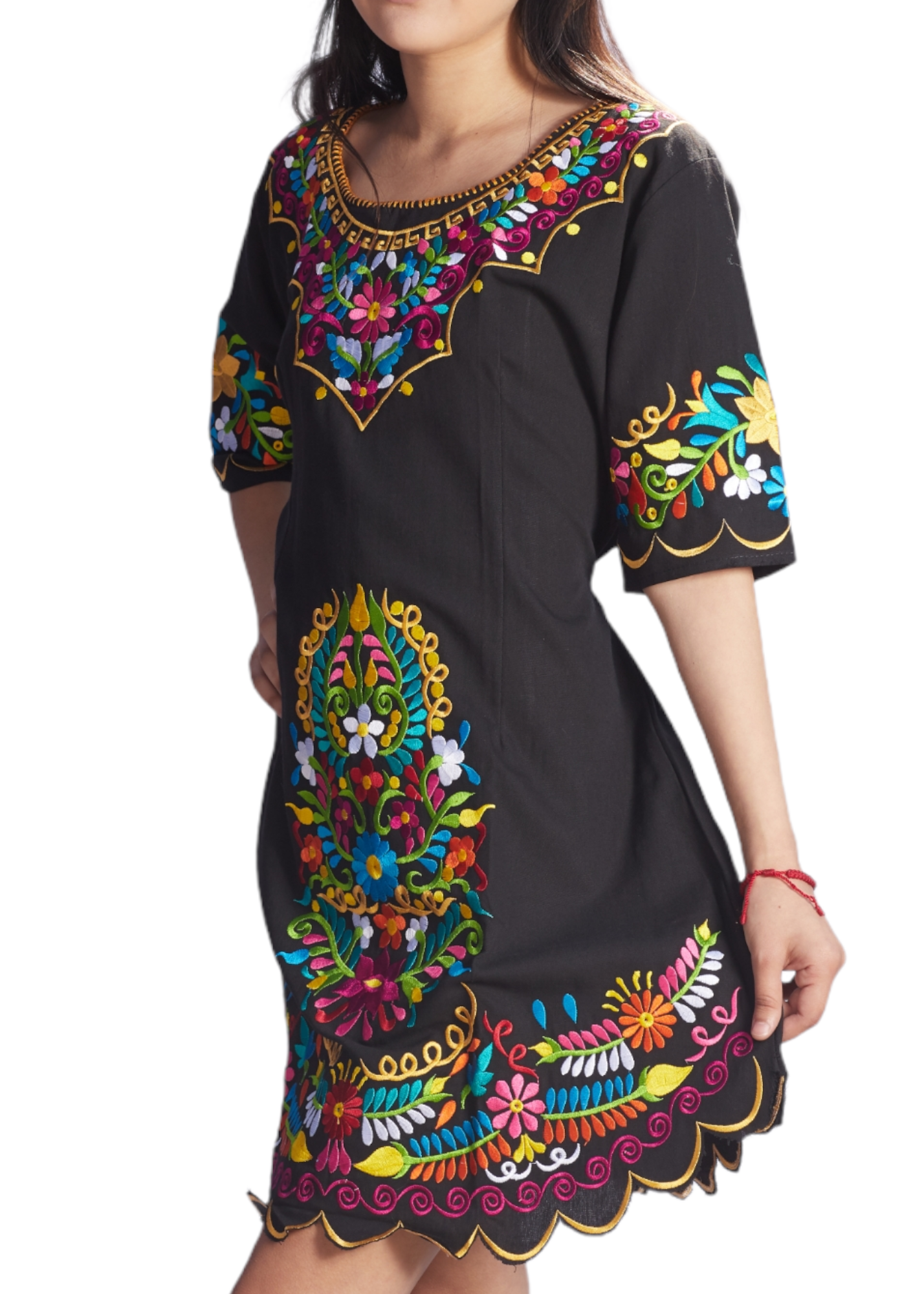 This beautiful floral embroidered dress is perfect for everyday use or a special event. You will love the vibrant colors. The flowers are embroidered with threads that create a vibrant color and make it a unique design. Each dress has a unique embroidery so colors may vary. Materials: Cotton, Embroidered with silk threads.