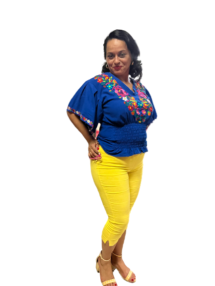 Embroidered traditional Mexican style blouse with flower pattern. The flowers are embroidered with threads that create a vibrant color and make it a unique design. Front of blouse designed to provide extra comfort. We carry in four colors; hot pink, red, blue and canary yellow.