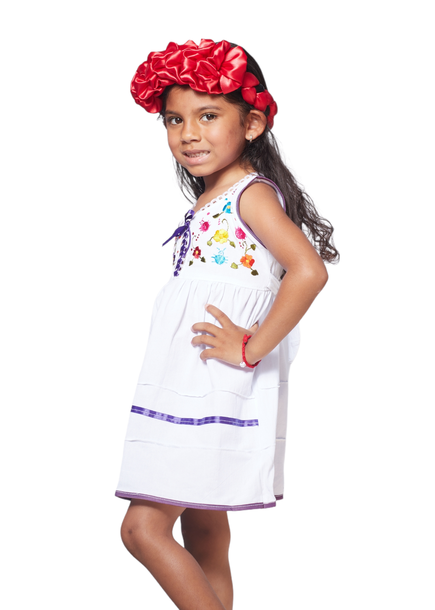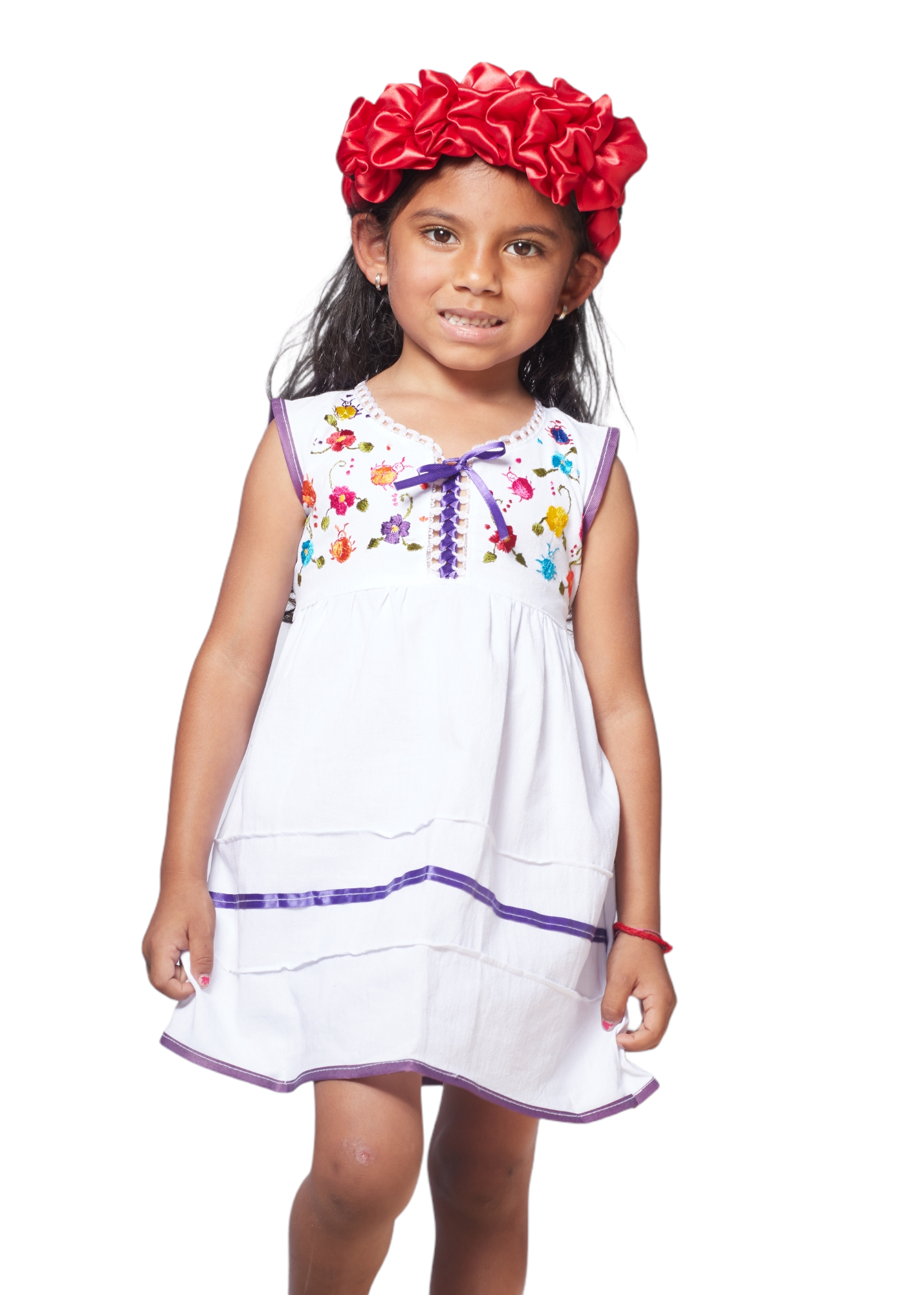 This beautiful floral hand embroidered dress is perfect for everyday use or a special event. You will love the vibrant colors. The flowers are embroidered with threads that create a vibrant color and make it a unique design. Each dress has a unique embroidery so colors may vary. Materials: Cotton and Embroidered with Silk. Available in off white with blue or green ribbon, turquoise and hot pink.