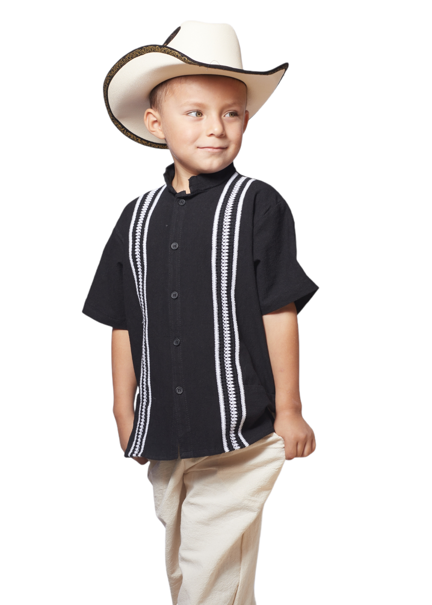 Boy guayabera and pant set. Material 100% cotton/Manta. Black on beige.