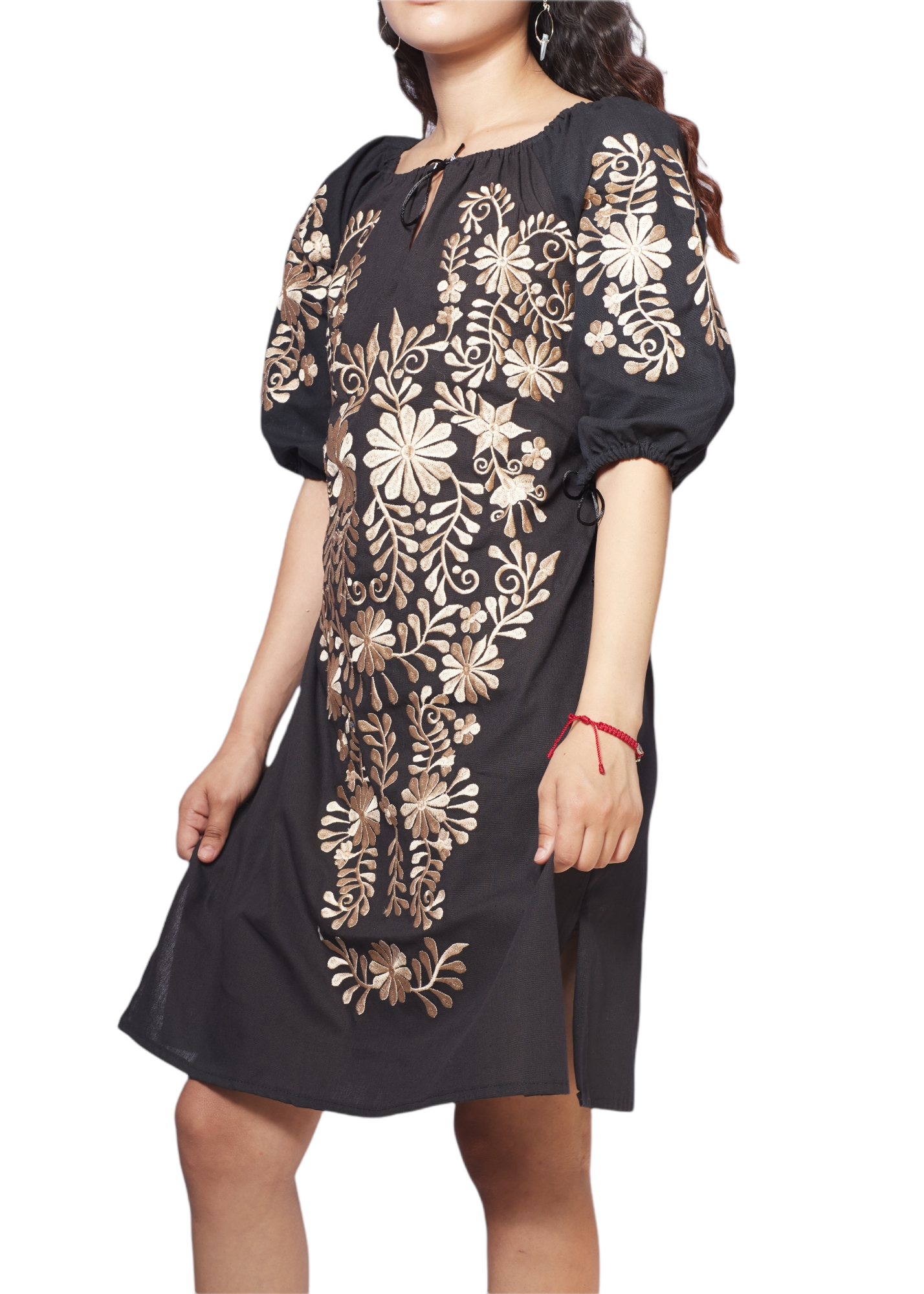 This beautiful floral embroidered dress is perfect for everyday use or a special event. You will love the vibrant colors. The flowers are embroidered with threads that create a vibrant color and make it a unique design. Each dress has a unique embroidery . Materials: Cotton, Embroidered with Silk threads.