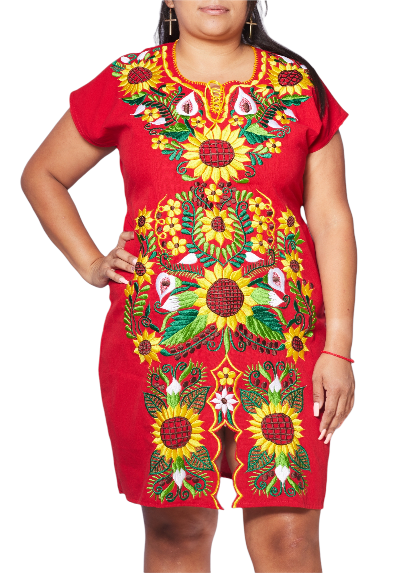 This beautiful floral embroidered dress is perfect for everyday use or a special event. You will love the vibrant colors. The flowers are embroidered with threads that create a vibrant color and make it a unique design. Each dress has a unique embroidery so colors may vary. Materials: Cotton, Embroidered with silk threads.