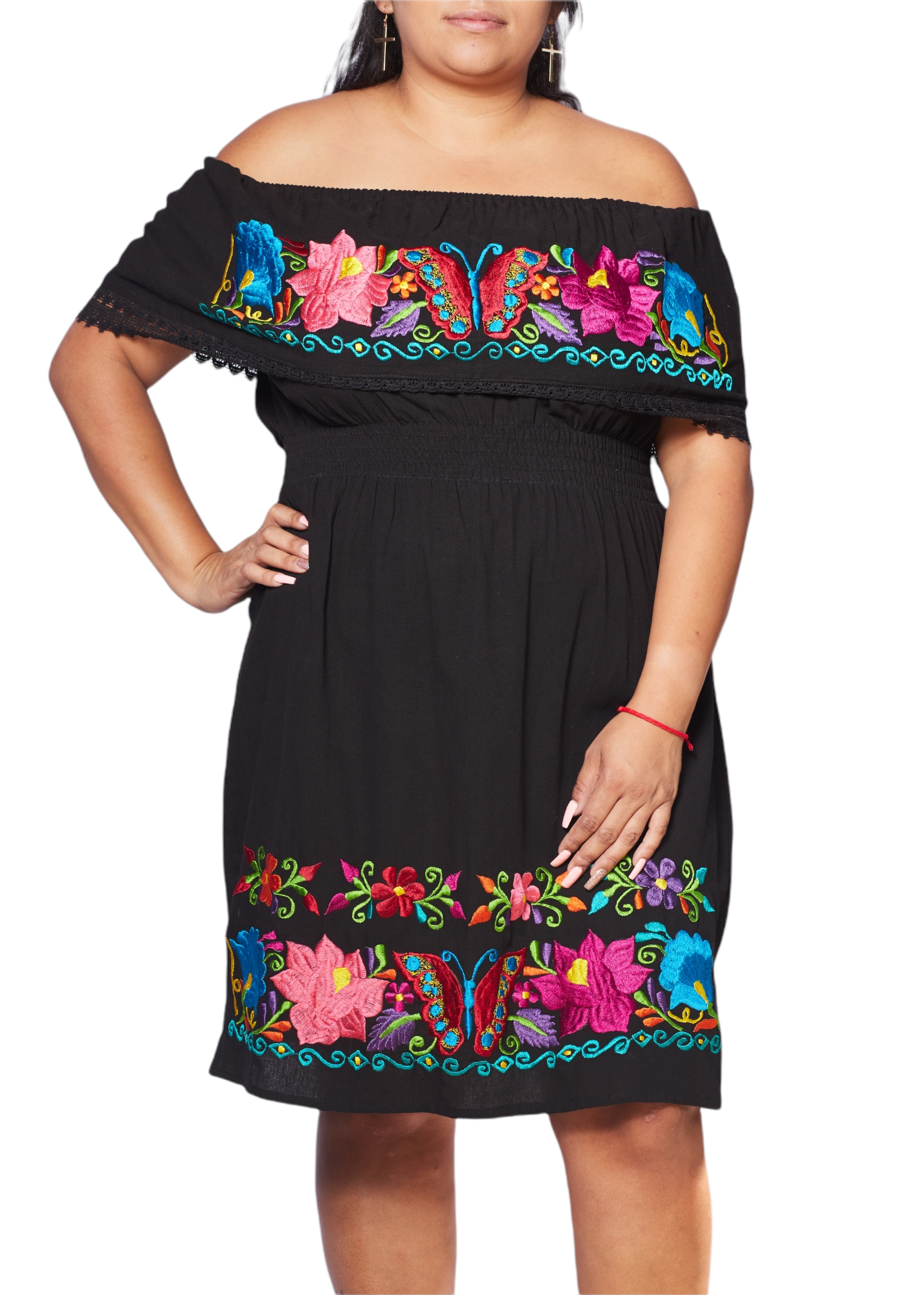 This beautiful floral embroidered dress is perfect for everyday use or a special event. You will love the vibrant colors. Cinch waist. The flowers are embroidered with threads that create a vibrant color and make it a unique design. Each dress has a unique embroidery so colors may vary. Materials: Cotton, Embroidered with silk threads.