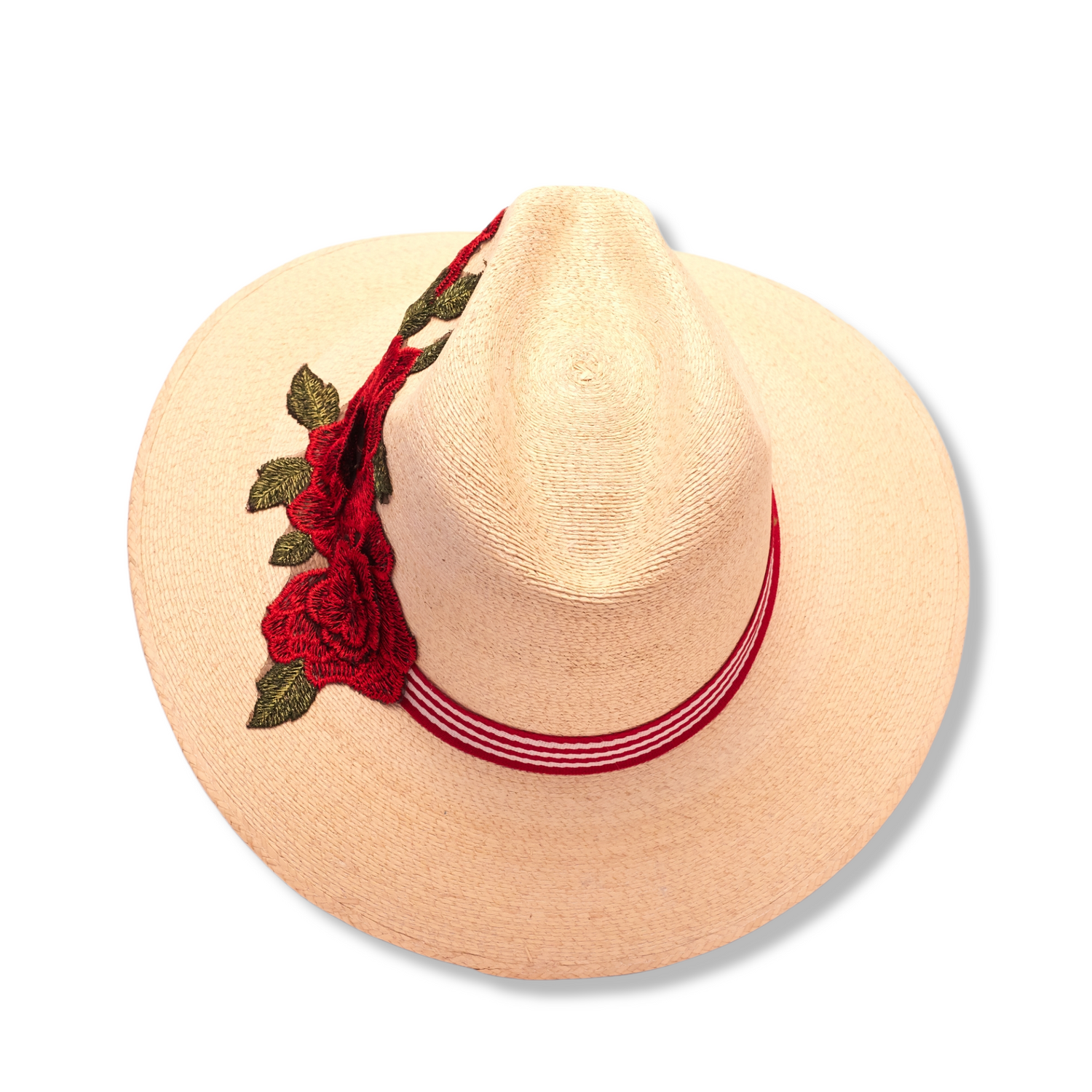 This hat is very unique. It will definitely put fashion at its best! Light colored straw with a rose appliqué.