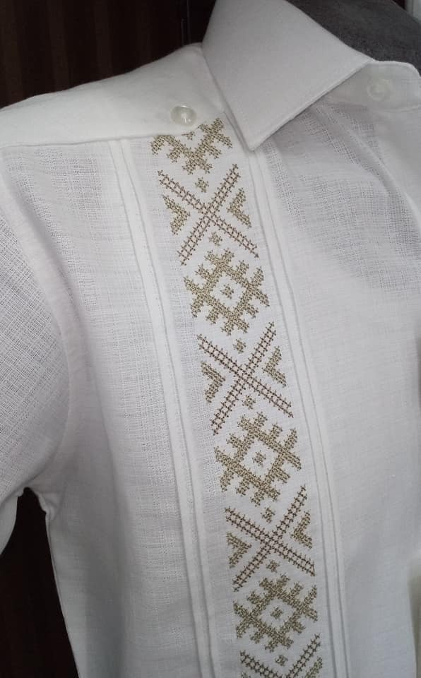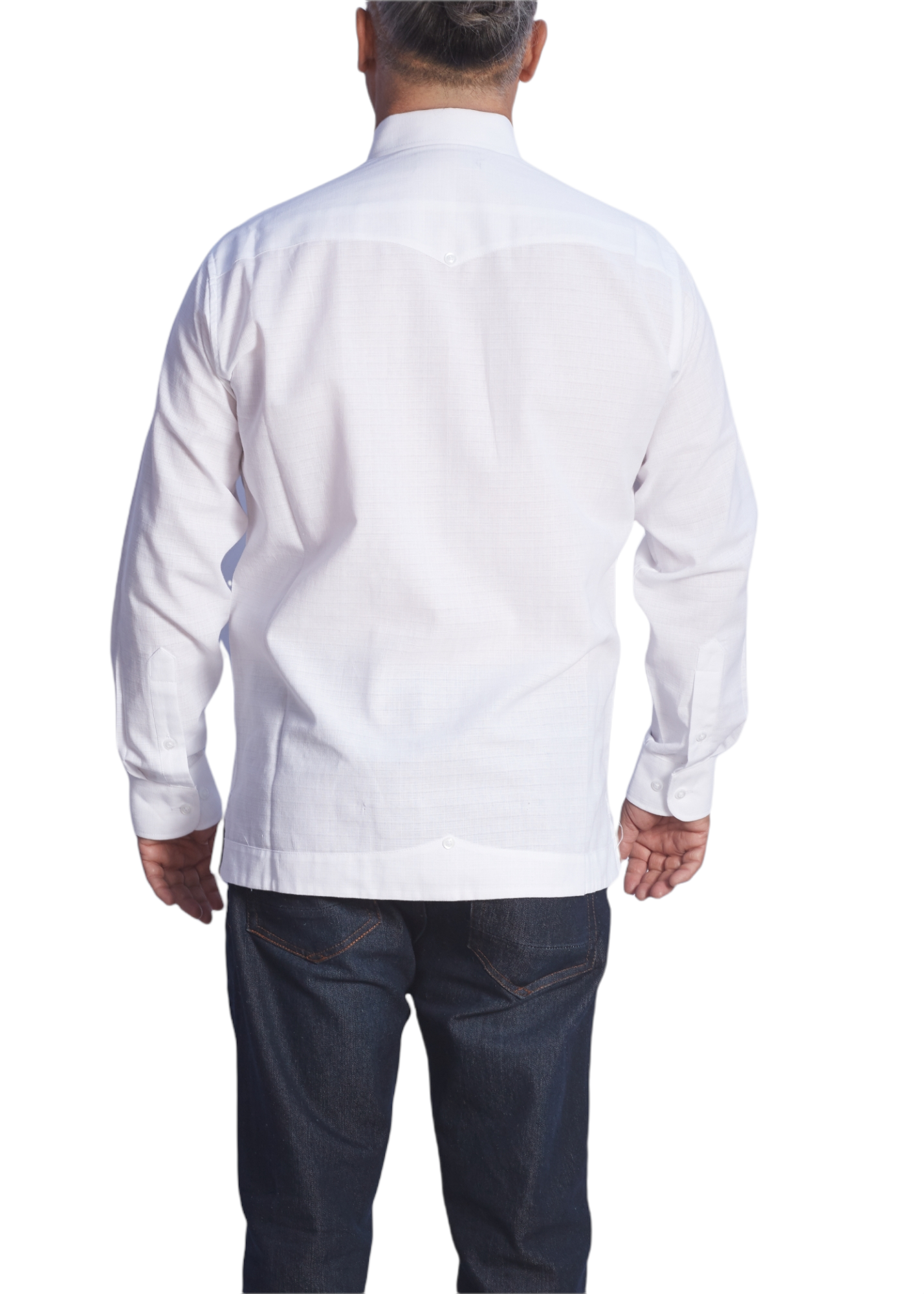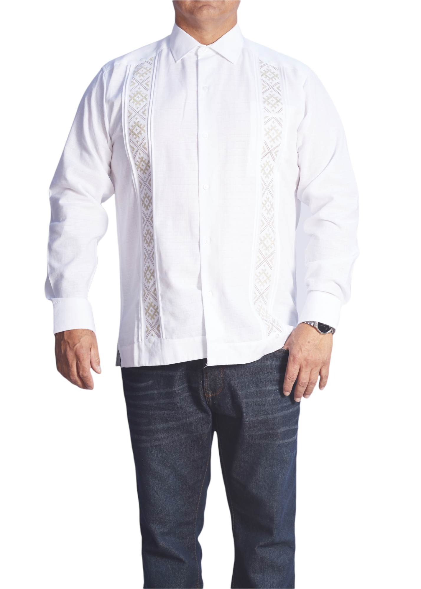 Elegant white Guayabera, Handmade artisan designer embroidery formal dress shirt for men. Lightweight fabric keeps you cool in the tropics. Embroidered cross stich, colors and designs may vary slightly since these are all handmade. Suggested to dry clean. Guayabera D'Carlos. Algodón y bordado punto de cruz. Manga larga. Made in Merida, Mxco.